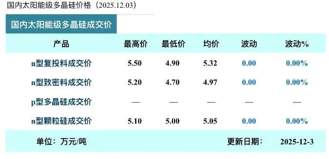 据信息服务机构安泰科统计,在11月最后一周,多晶硅N型复投料成交价格区间为4.9万~5.5万元/吨,成交均价为5.32万元/吨,环比持平。N型颗粒硅成交价格区间为5.0万~5.1万元/吨,成交均价为5.05万元/吨,环比持平。
